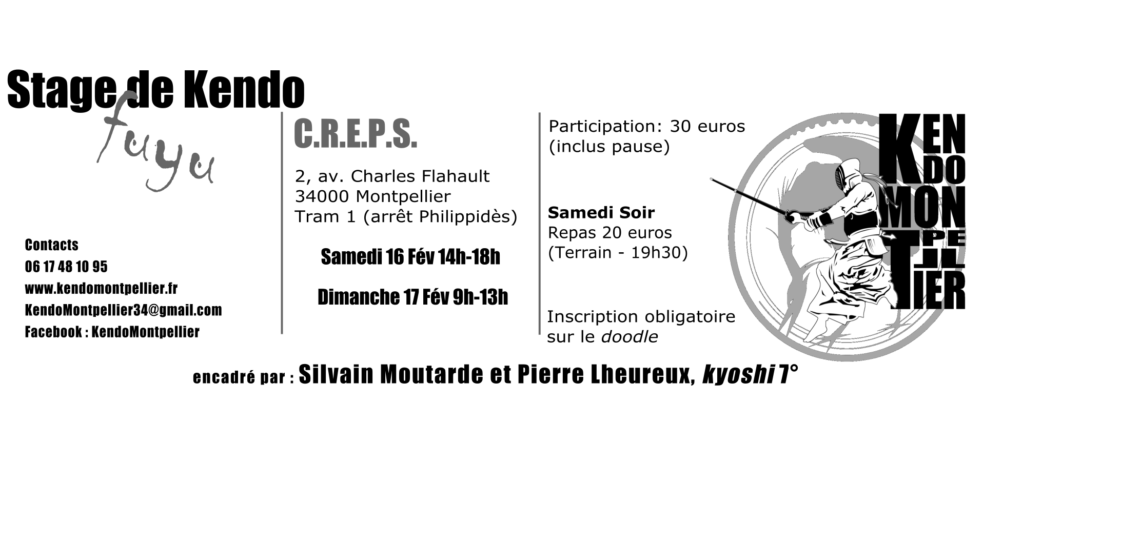 Prévoyez d'être en tenue (et armure), avec shinai vérifié et sac rangé, à 14h le samedi et 9h le dimanche, heure de début du stage (la salle ouvre 1h avant).